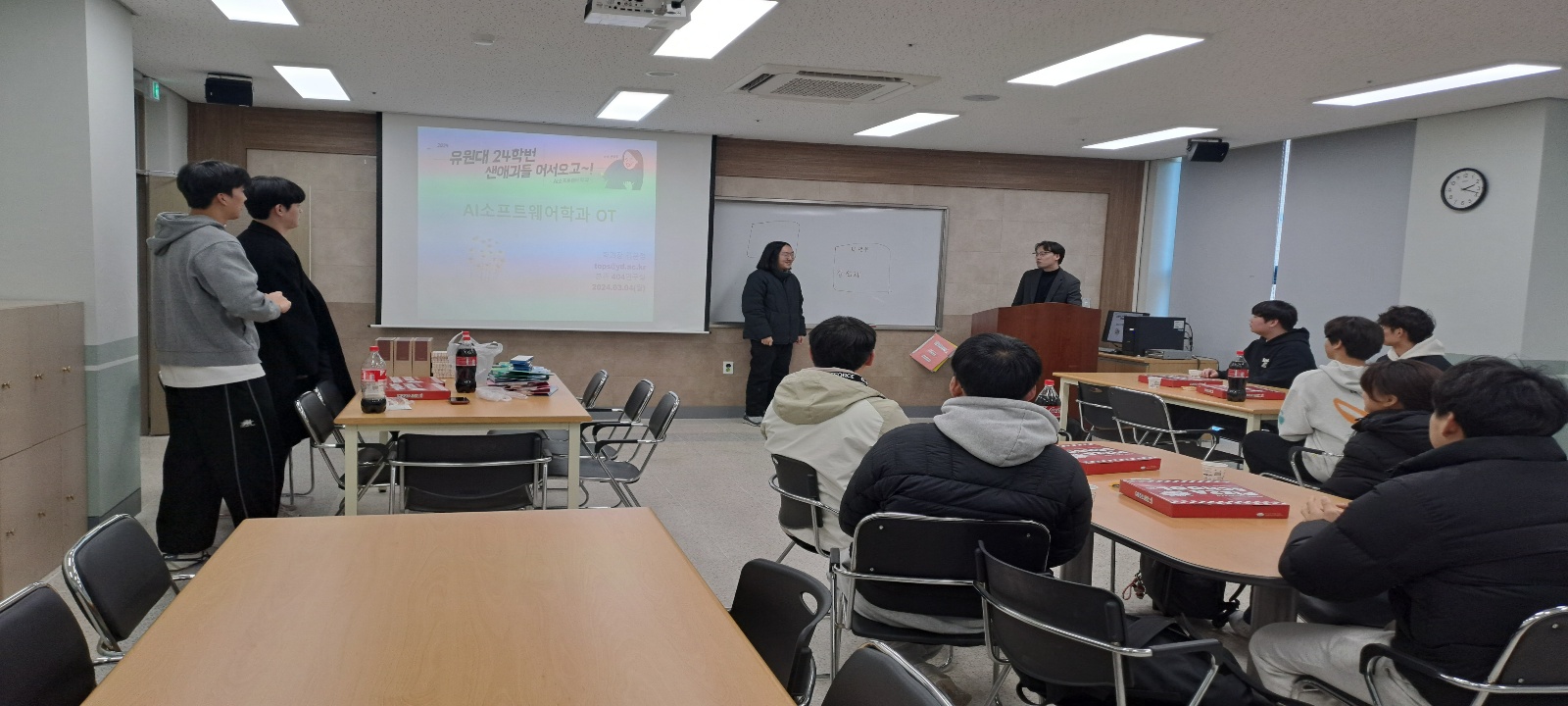 안녕하세요. AI소프트웨어학과입니다. 2024학년도 1학기 1, 2, 3, 4학년 개강 맞이 환영 행사가 2024-03-13(수) 오후7시 퇘랑 두정역점에서 진행되었습니다. 참석해주신 김재홍, 김문정, 김성익교수님, 재학생 1, 2, 3, 4학년 학생들이 자리를 빛내주셔서 더욱 즐거웠던 행사였습니다. 행사를 준비해주신 학생회장, 학회 임원 그리고 학년 과대표들에게 감사 인사 올립니다. 저희 AI소프트웨어학과를 찾아주신 모든 분들께 감사드리며 즐거운 1학기 되시길 바라겠습니다. 감사합니다.