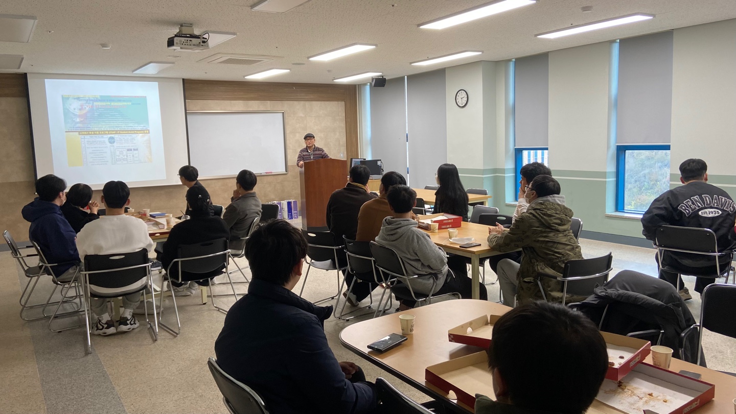 ■ 2022-2학기 스마트IT 학생 지원 프로그램(ITSAP : IT Student Assist Program) 행사 안내 - 날짜 : 2022.11.29(화) 14:00 ~ 15:00 - 참석 : 학생 - 학회장, 학년대표(4명), 부학회장, 총무, 차기 학회장, 관련 학생들 교수 - 김재홍, 김문정, 김성익 - 내용 : IT 커리어 관리 프로세스, 학생들 의견 청취, 교육 과정 개선 활동 및 재학생 관리, 2023-1학기 학과 운영 방안, 안전 교육 특히 종강 모임에 대한 안전 교육 등 ■ 2022.11.29 ITSAP 행사 결과 - 20 여명의 재학생들과 학과 전임 교수가 참석하여 이번 학기 학과 운영 및 강의에 대한 의견 교환 - 현 학생회 임원 인사 - 차기 학과 학회장 소개 - 이번 학기 학과 행사 시상식 등